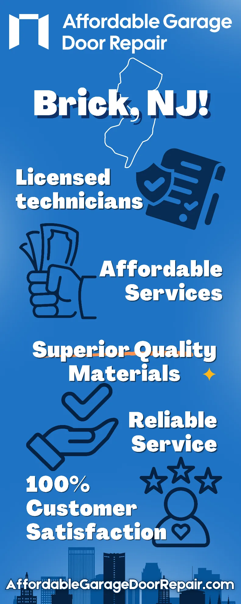 Affordable Garage Door Repair is dedicated to offering Brick, NJ, professional, reliable, and affordable garage door services. Whatever your situation, broken spring, broken opener, or installation we can help.