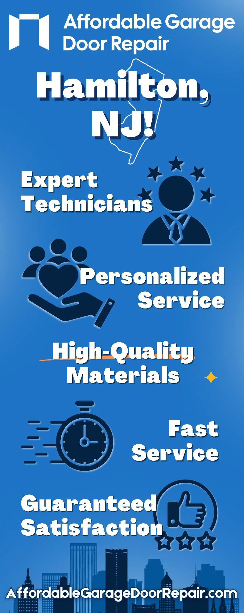 Affordable Garage Door Repair New Jersey proudly offers high-quality garage door service to residential and commercial properties in Hamilton, New Jersey. Our skilled technicians specialize in handling everything, from emergency repairs and routine maintenance to new installations. Our team of experts is ready to help you with all your garage door needs, including same-day service and emergency support 24/7, so you can keep your garage door safe, operational, and functional every day of the year!