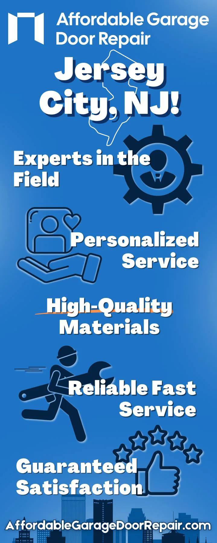 Affordable Garage Door Repair Company provides garage door services to the people and businesses of Jersey City, New Jersey. From emergency repairs and routine upkeep to fresh installations, our experienced technicians are at your service. Whether you need 24/7 emergency assistance or same-day service, we keep your garage door secured, functional, and reliable all year round.