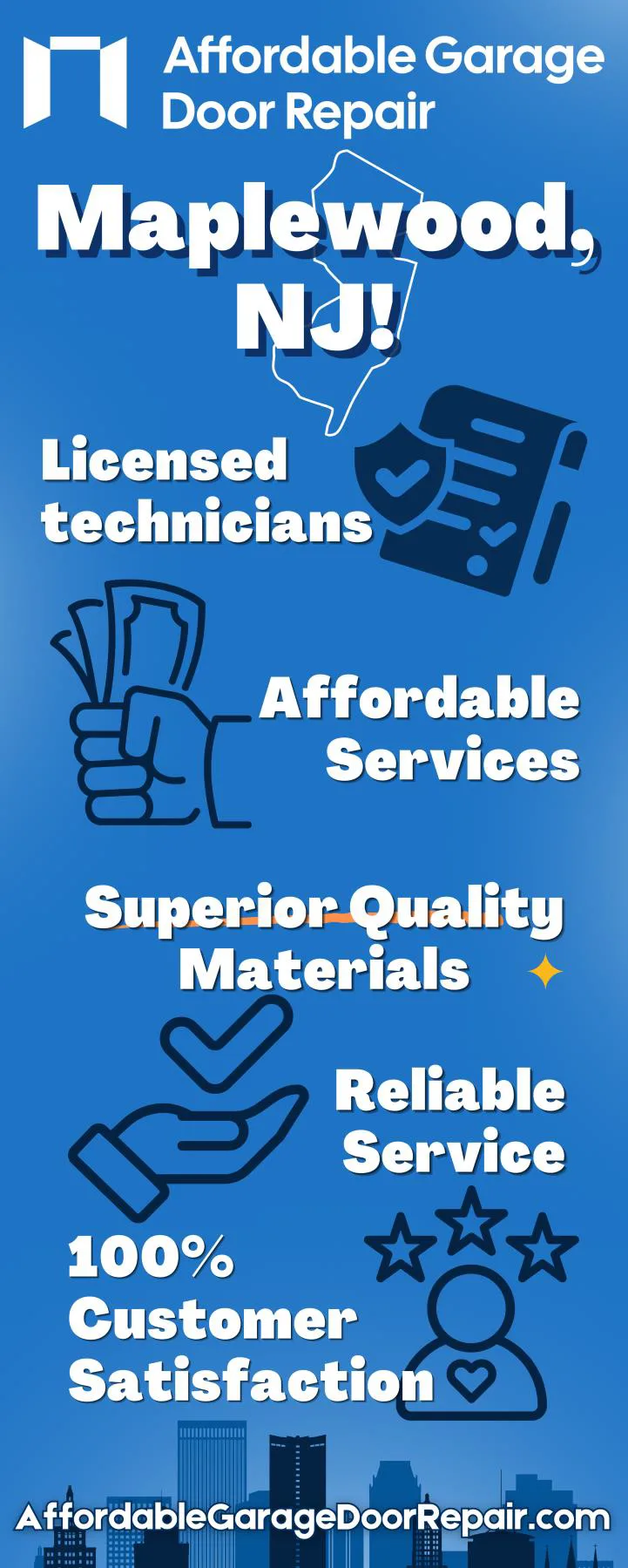 A working garage door is important for security, convenience, and curb appeal. If you have a problem with your garage door, whether it is just a quick repair, you need a new installation or competing routine maintenance, it is important to have a dependable and trustworthy garage door service provider. Affordable Garage Door Repair in Maplewood, New Jersey