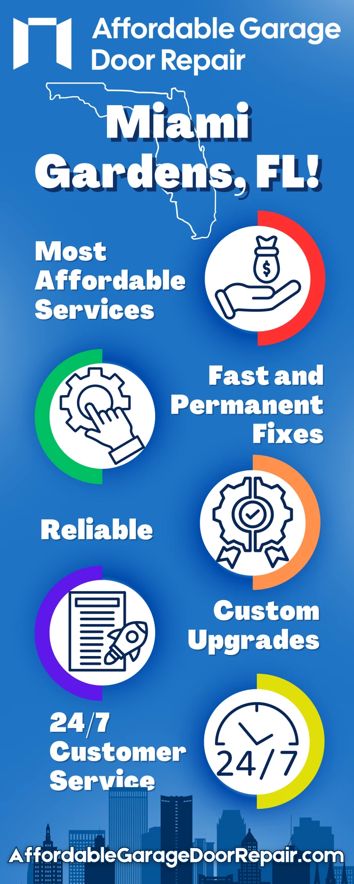 Whether you’re working with an aging garage door that won’t open, is making strange noises, or needs a full replacement, you need trusted expert service. Affordable Garage Door Repair is your source for fast, efficient, and affordable garage door service for both residential and commercial garage doors in Miami Gardens, Florida. All our garage door technicians are seasoned professionals dedicated to making sure your garage door operates correctly, providing you with a safe and functional home.