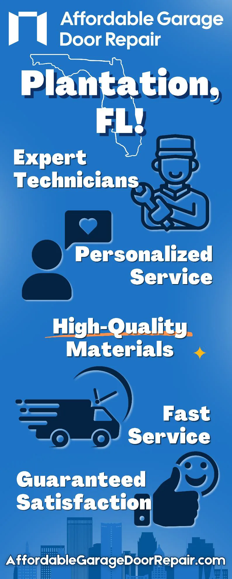 Whether you need a simple fix or a full garage door replacement, our services cater to both homes and businesses in Plantation.
