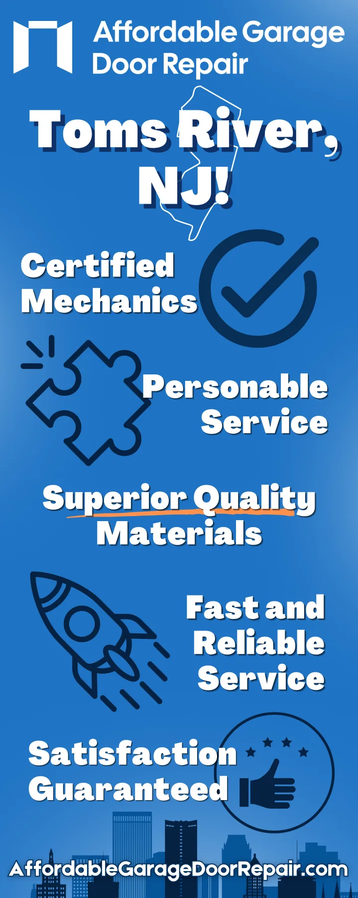 We are dedicated to serving Toms River, NJ, with expert, cost-effective, professional garage door services. From broken springs to faulty openers, and full installation, our professional team is here to help.