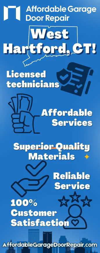 Affordable Garage Door Repair Western Hartford, Connecticut provides an excellent garage door service for your residential and commercial needs in Western Hartford CT. We have licensed experts who can assist you with urgent repairs, routine maintenance, or a new setup. Our team is available for same-day service and 24/7 emergency support to keep your garage door safe, working properly, and reliable all year round.