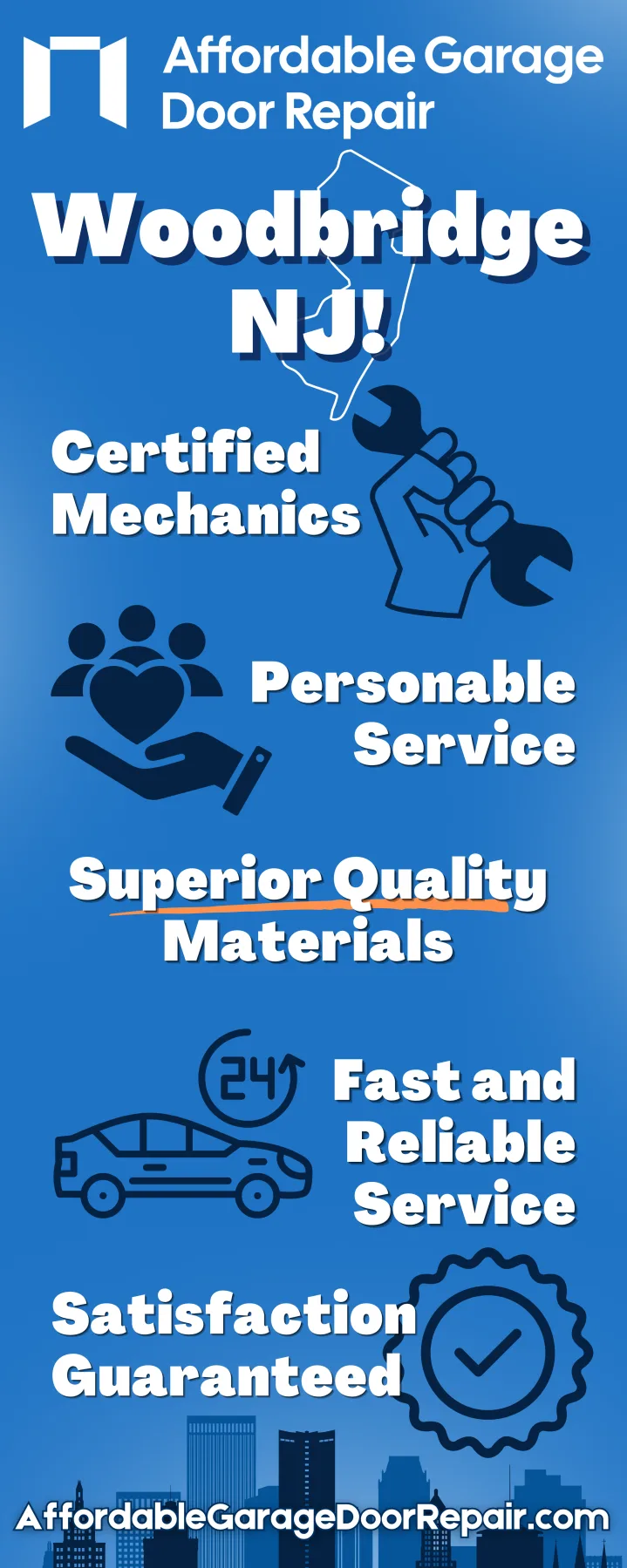 Your Garage Door Service in Woodbridge, NJ Affordable Garage Door Repair focuses on professional, affordable & quality garage door services in Woodbridge, NJ. Whether it involves repairing a broken spring, fixing a malfunctioning garage door opener, or installing a new garage door altogether, we offer our services at a competitive price without sacrificing quality.