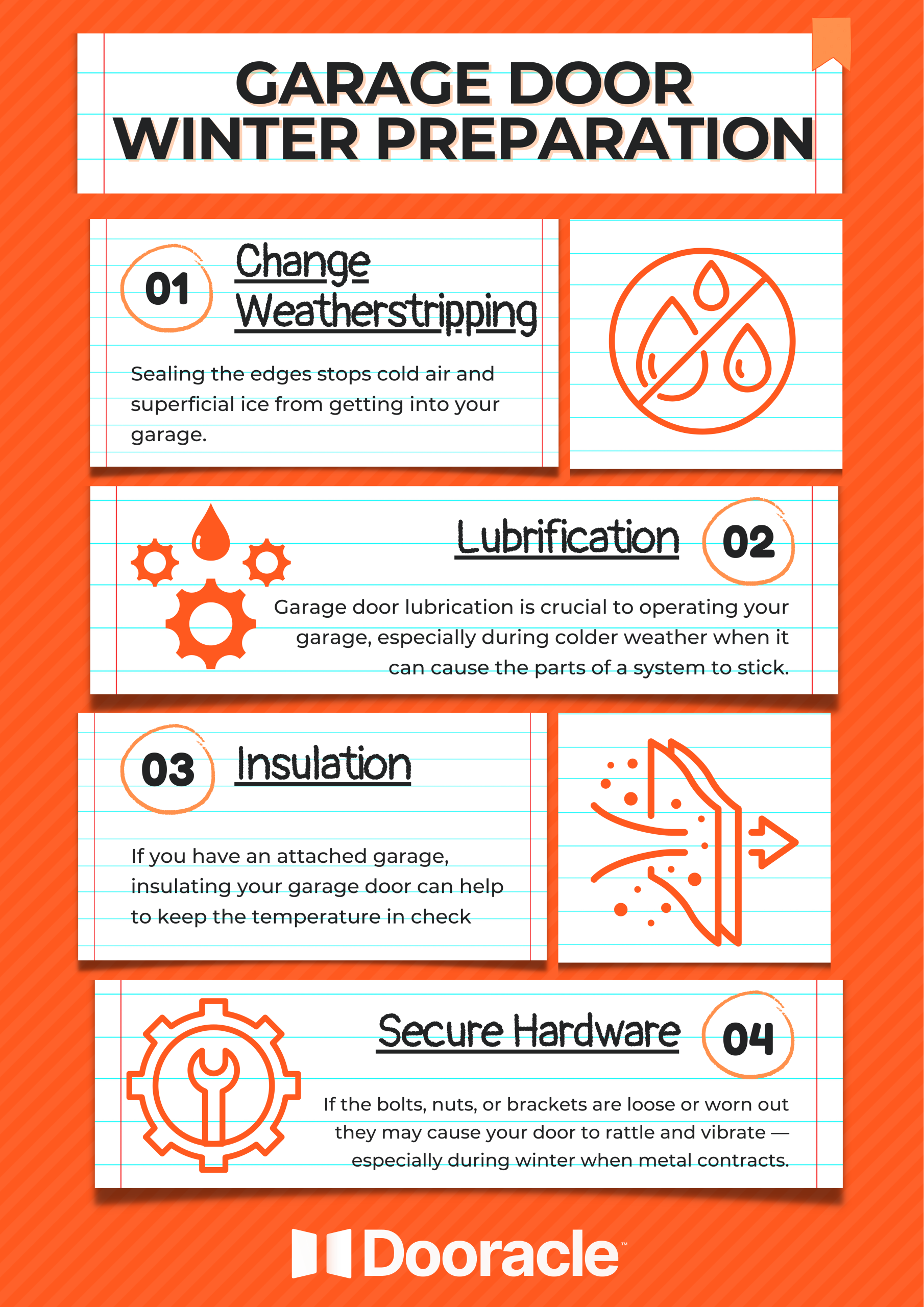 If the bolts, nuts, or brackets are loose or worn out they may cause your door to rattle and vibrate — especially during winter when metal contracts.