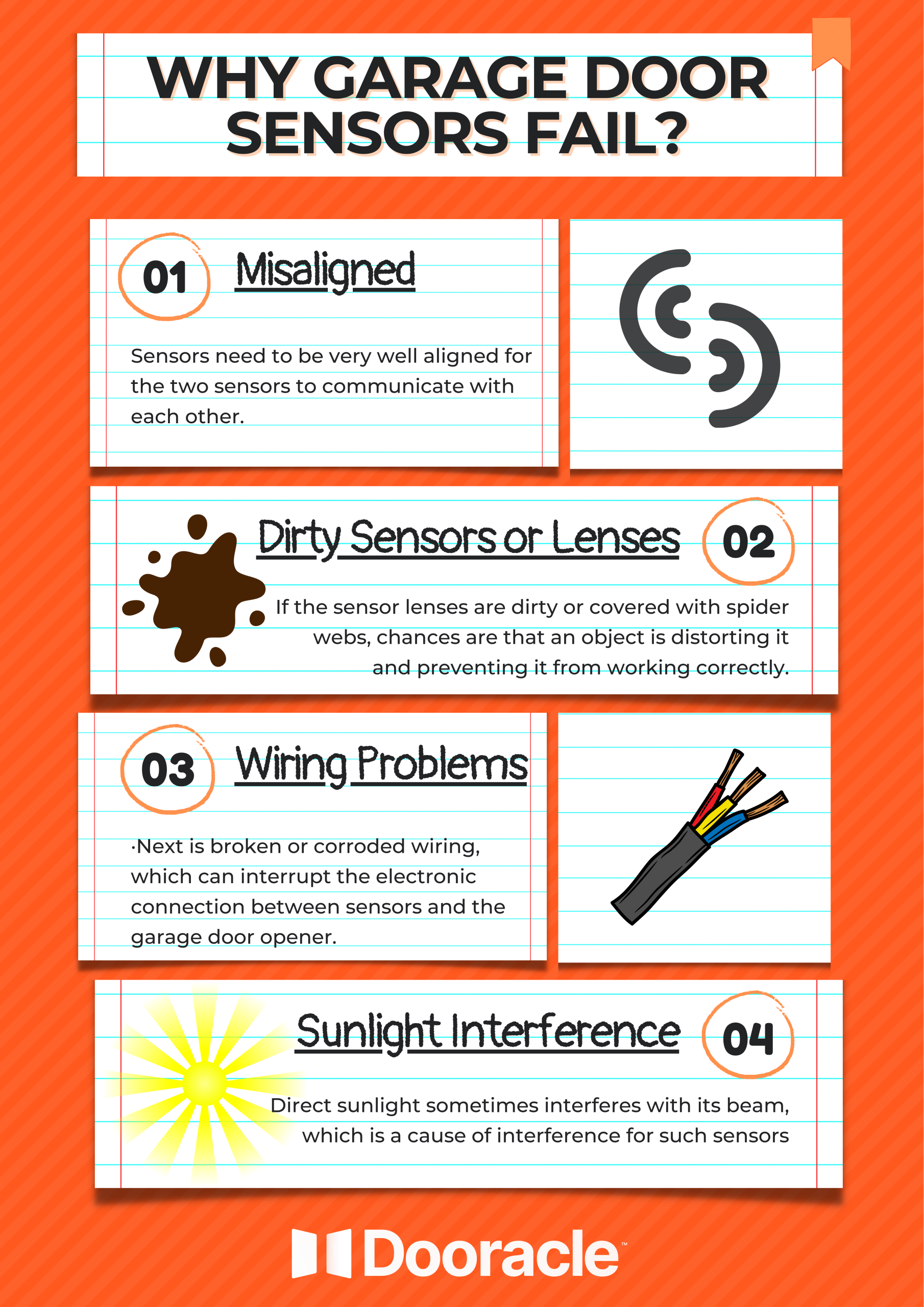 What do I need garage door sensors for? But, even so, these sensors can goof up leaving your garage door in limbo. By knowing why your sensor has failed and how you can potentially rectify the problem, it could save you time, money, and a headache in the long run.